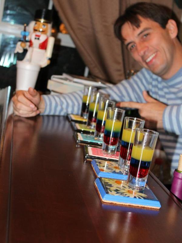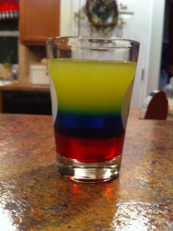 Colombia Shot! Ingredients: Grenadine, Bols Blue Curacao, Smirnoff Vodka 80 Proof, Orange Juice, Lemon Juice Mix the lemon and orange juice together with Aguardiente/Vodka and ice. Layer in a shot glass in this order: 1st. Grenadine 2nd. Blue CuraƧao. (on top) 3rd. The mix you made for the yellow. Voila !!!! You have our flag!!